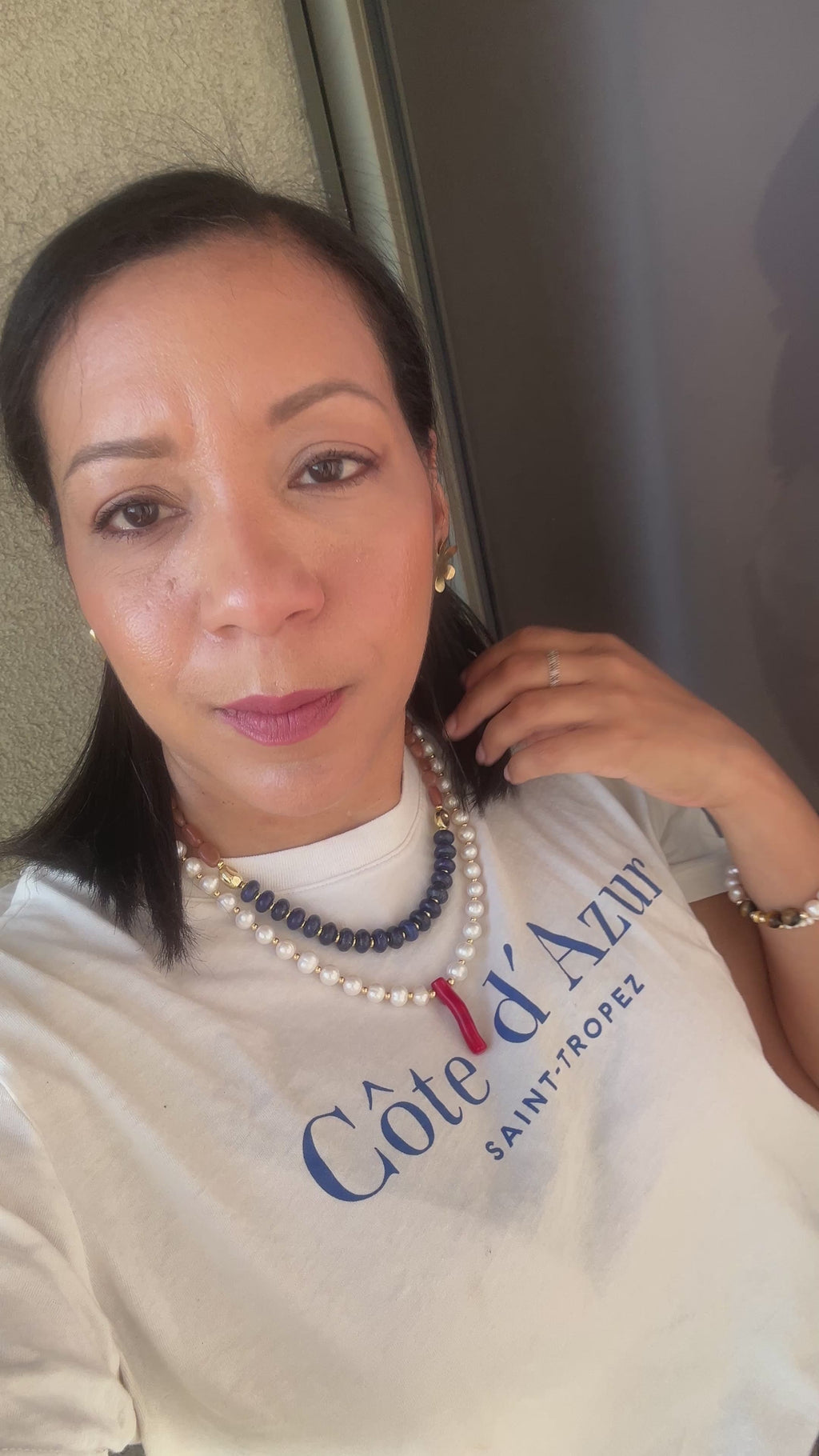 El Collar Vera está elaborado con lapislázuli natural y perlas, una combinación que equilibra profundidad, luz y elegancia atemporal.